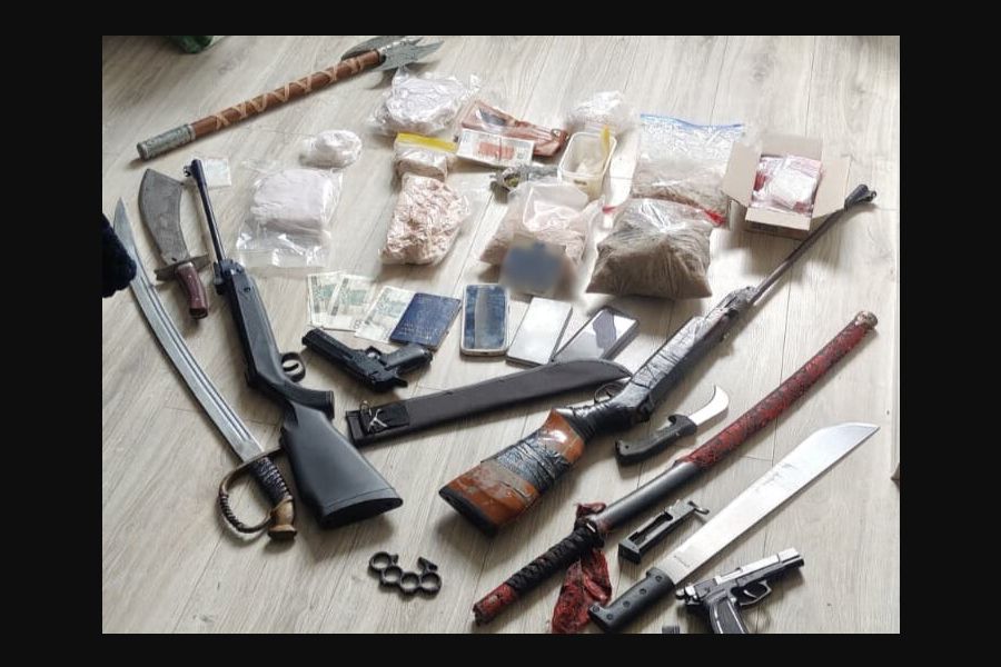 Podczas przeszukania mieszkania, mundurowi znaleźli woreczki z różnymi substancjami. Testy potwierdziły, że była to amfetamina oraz marihuana – w sumie ponad 7 kilogramów. Policjanci dodatkowo znaleźli w mieszkaniu przedmioty przypominające broń, maczety, szable oraz kastet.