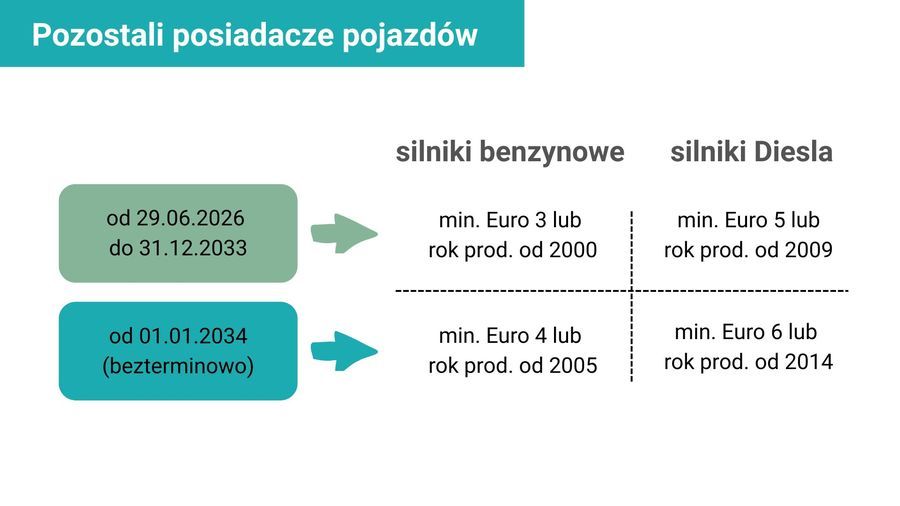 Wyłączenie obowiązuje także motocykle, pojazdy klasyfikowane jako inne, np. specjalne. Do strefy wjadą  autobusy realizujące przewozy w ramach publicznego transportu zbiorowego. Także pojazdy uczestniczące w imprezach związanych z korzystaniem z drogi w sposób szczególny. Zakaz nie dotyczy zarówno pojazdów zabytkowych, jak i historycznych.