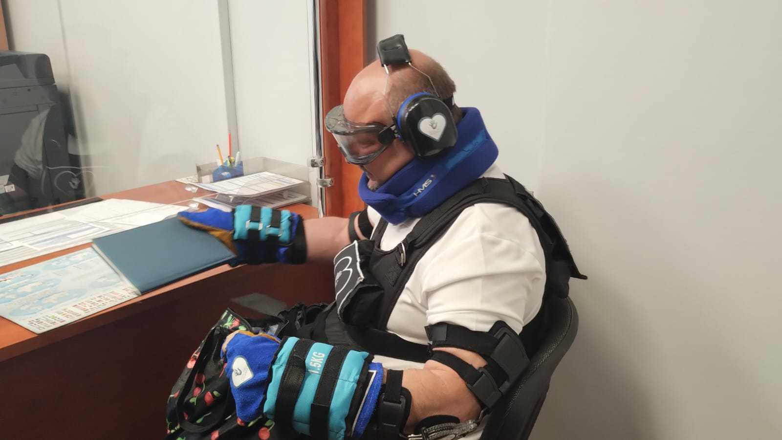 Jak podkreślał Grzegorz Wanot, największą trudność sprawiło unieruchomienie stawów kolanowych i łokciowych. To właśnie ono mocno utrudniało sięganie do torby, poruszanie się oraz wykonywanie precyzyjnych ruchów. Dodatkowo ciężar rozmieszczony na klatce piersiowej, kostkach i nadgarstkach wywoływał szybkie zmęczenie, szczególnie poza budynkiem, podczas krótkiego spaceru.