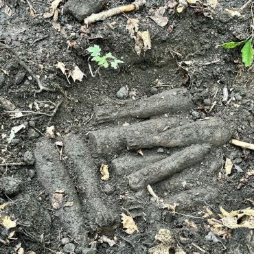 Policjanci i strażnicy miejscy z Mysłowic zabezpieczają miejsce odnalezienia niewybuchów z czasów II Wojny Światowej. Znalazł je mężczyzna spacerujący w lesie, w dzielnicy Janów.