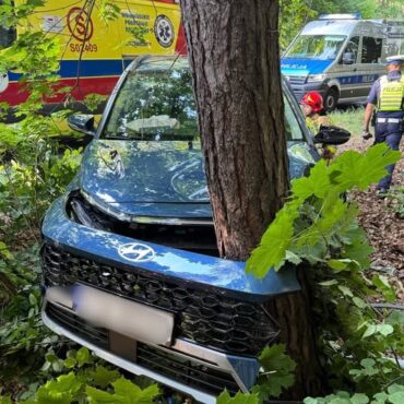 Groźny wypadek w Tarnowskich Górach. Samochód zjechał z drogi, skosił znak drogowy i zatrzymał się na drzewie.